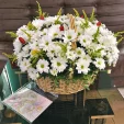 ДЕЛЮКС: хризантема кустовая ромашковая белая - 25 шт., солидаго - 10 шт.(возможна замена на декоративную зелень), оазис, сердечки маленькие красные (декоративные) - 9 шт., корзина большая.