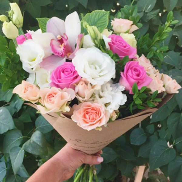 Букет составлен из роз белых оттенков сорта Мондиаль, розовых роз Ангажемент и кустовых роз розового цвета. Дополнена композиция белой эустомой и прекрасной розовой орхидеей, которая в давние времена, считалась цветами аристократов, а окраски могли символизировать особое отношение: так розовая орхидея, используемая в композиции «говорит» о нежных чувствах. Довершает композицию декоративная зелень и стильная крафтовая упаковка, перевязанная лентой в тон цветов.