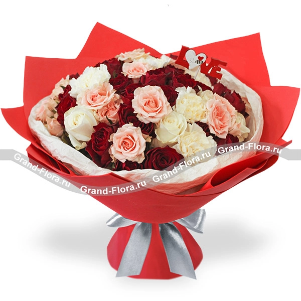 Стандартный: роза красная (Россия) 50 см. - 3 шт., роза белая (Россия) 50 см. - 2 шт., роза розовая (Россия) 50 см.- 2 шт., гвоздика белая - 2 шт., упаковка, декор, лента.