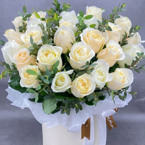 25 роз: роза белая (Россия) 50 см.,- 25 шт., коробка круглая средняя (20*30) - 1 шт., эвкалипт, оазис.